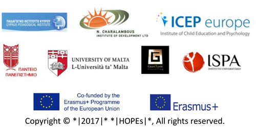 O Projeto HOPEs é financiado pela Comissão Europeia no âmbito do programa ERASMUS + KA2 - Cooperação para a Inovação e o Intercâmbio de Boas Práticas (Parcerias Estratégicas para a Educação Escolar). A parceria estratégica envolvendo cinco países europeus foi criada com base na vasta experiência de todos os membros do consórcio em temas relacionados com a Psicologia Positiva, Psicologia da Educação e Educação para a Cidadania.